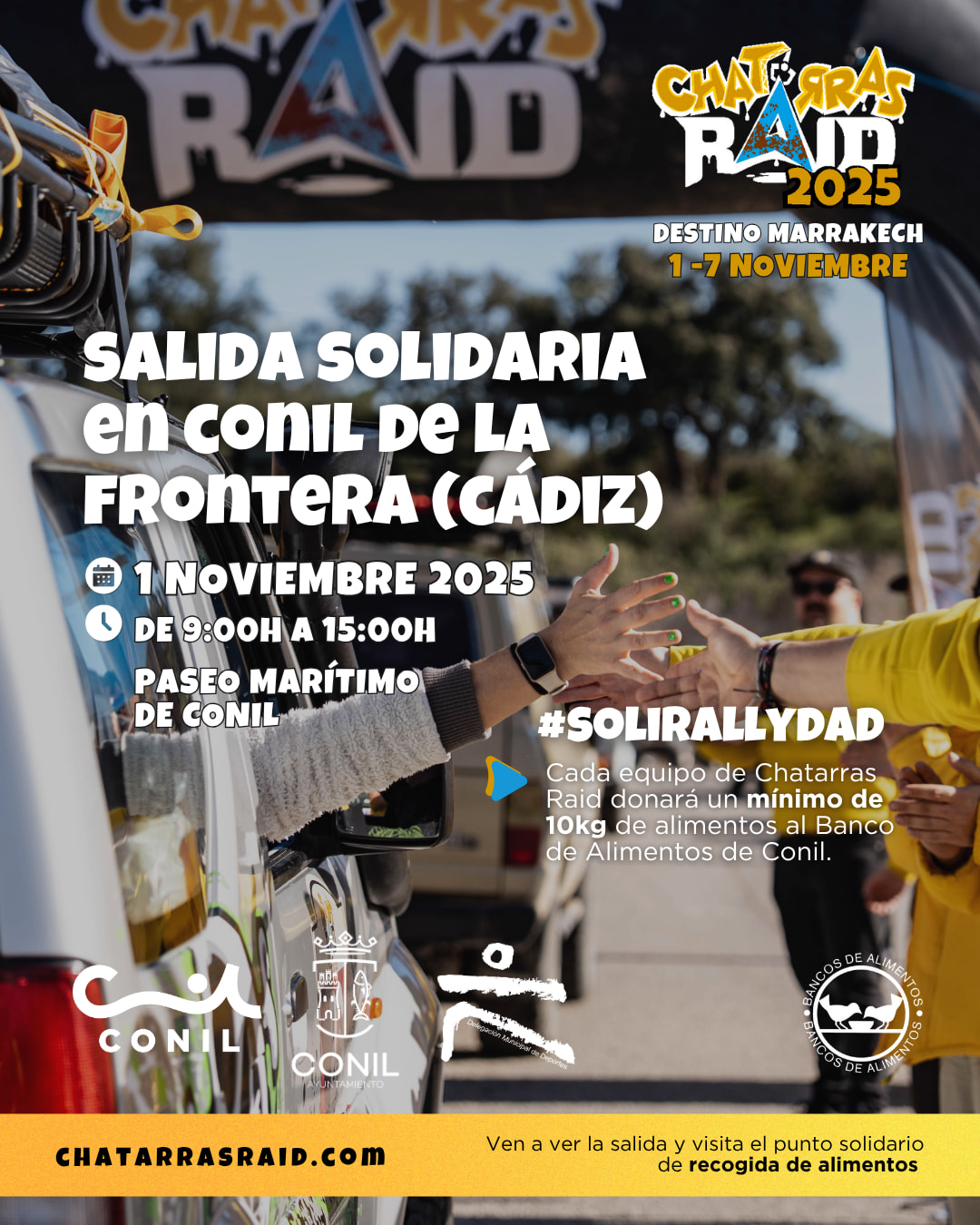 Como es tradición, la salida oficial del Chatarras Raid estará vinculada a una causa solidaria.En esta edición, el Banco de Alimentos de Conil será el beneficiario de la acción, recibiendo un mínimo de 10 kilos de productos de primera necesidad por cada equipo participante.