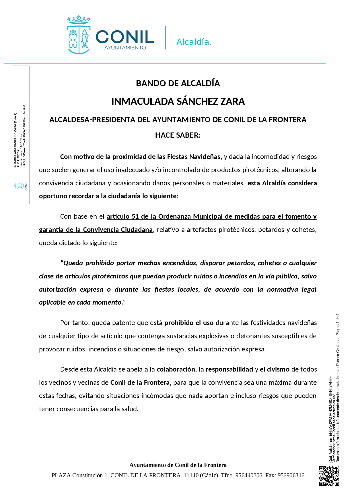 El Ayuntamiento de Conil a través de un Bando de Alcaldía recuerda la prohibición de la pirotecnia en el término municipal durante las fiestas navideñas.