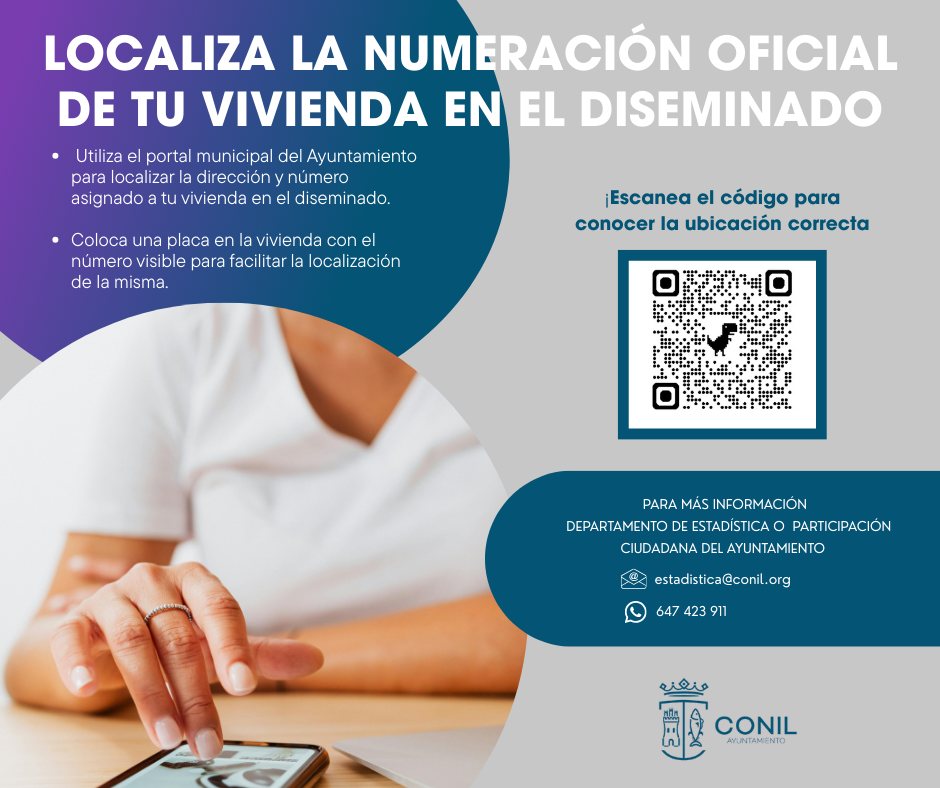 Desde el Área Municipal de Estadística y Participación Ciudadana se pone en marcha una campaña informativa para facilitar la actualización y localización de la numeración oficial de las viviendas situadas en el diseminado. El proceso es muy sencillo, se puede realizar escaneando el código QR o a través de la web del Ayuntamiento.